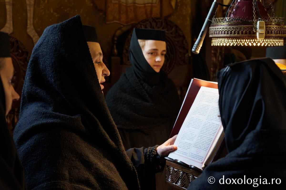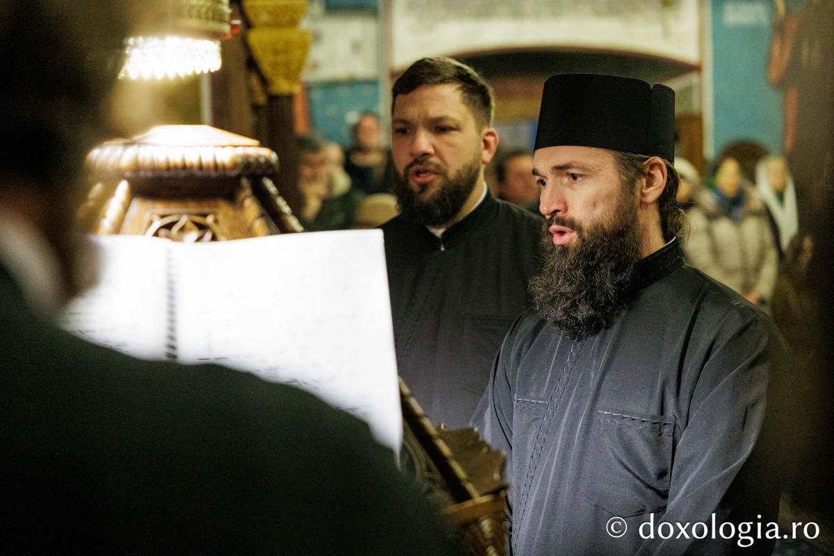 La slujba privegherii a slujit un sobor de preoți și diaconi sub protia părintelui arhimandrit Elisei Nedescu, starețul Mănăstirii „Sfinții Trei Ierarhi” din Iași, iar răspunsurile liturgice au fost date de Corul preoțesc „Apostolii” (în strana dreaptă) și, respectiv, de corul mănăstirii Copou (în strana stângă).