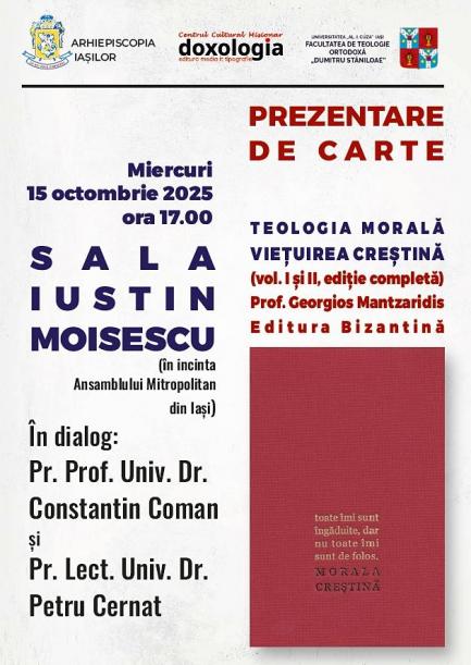 Evenimentul de săptămâna viitoare, programat să se desfășoare spre finalul Hramului Sfintei Cuvioase Parascheva, este organizat de Arhiepiscopia Iașilor prin intermediul Centrului Cultural-Misionar „Doxologia”, și îl are ca invitat pe pr. prof. univ. dr. Constantin Coman de la Facultatea de Teologie Ortodoxă „Justinian Patriarhul” din București. Clericul va prezenta volumul alături de pr. lect. dr. Petru Cernat de la Facultatea de Teologie din Iași.